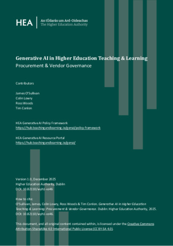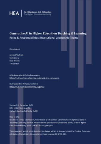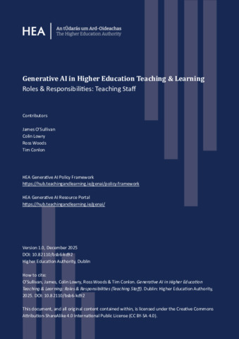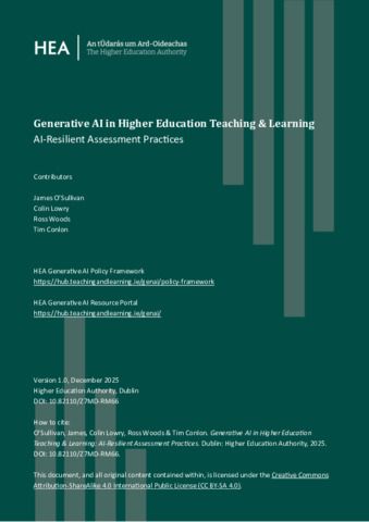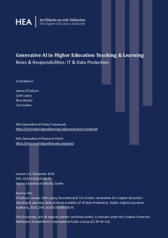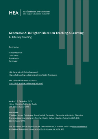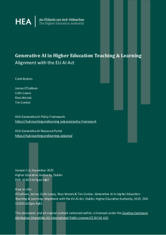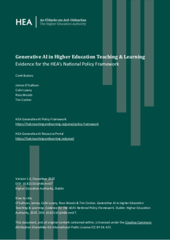 O'Sullivan, James, Lowry, Colin, Woods, Ross and Conlon, Tim (2025) Generative AI in Higher Education Teaching & Learning: National Policy Framework. Higher Education Authority, Dublin.