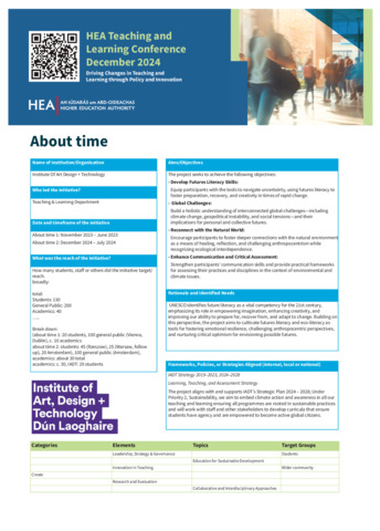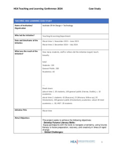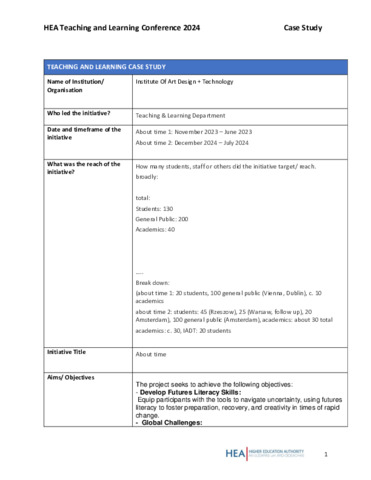 This case study from the Institute of Art, Design + Technology (IADT) describes About Time, a two-phase initiative (2023–2024) led by the Teaching & Learning Department that integrates futures literacy and eco-literacy through workshops and the development of The Barometer workbook. Delivered in Dublin, Rzeszów, Warsaw, Vienna, and Amsterdam, the project engaged students, academics, and the wider public. It aimed to develop futures literacy skills, address interconnected global challenges, foster ecological awareness, and build emotional resilience. The initiative has led to international collaborations, academic publications, and the incorporation of its methods into IADT modules.