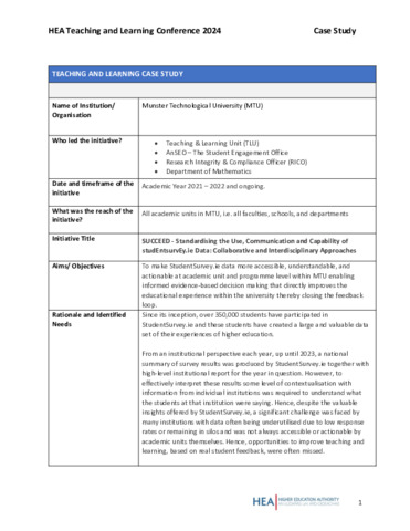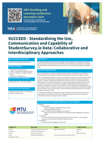 This case study from Munster Technological University (MTU) describes SUCCEED – Standardising the Use, Communication and Capability of StudentSurvey.ie Data, an ongoing initiative (since 2021–22) led by the Teaching & Learning Unit in collaboration with AnSEO and the Research Integrity & Compliance Officer. Funded through SATLE, SUCCEED developed a standardised, reproducible reporting structure to make StudentSurvey.ie data accessible and actionable at academic unit and programme level. The initiative enables departments to analyse trends, compare indicators, identify strengths and areas for enhancement, and support data-informed decision-making to improve teaching, learning, assessment and student engagement across MTU