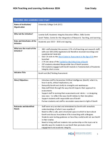 This case study from University College Cork (UCC) describes GenAI and (Re)Thinking Assessment (2023–2024 and ongoing), a collaborative initiative led by the Skills Centre and the Centre for the Integration of Research, Teaching, and Learning. The project supports staff and students in understanding Generative AI (GenAI), its ethical implications, and its impact on assessment practices. Activities include the development of open-access resources such as the Short Guide to Assessment in the Age of AI and the Toolkit for the Ethical Use of GenAI, monthly workshops, an AI + Assessment Hackathon, and student partnership projects including (AI)²ed. The initiative has engaged over 300 staff and 1,000+ students, promoting academic integrity, responsible AI use, and proactive redesign of assessments across disciplines