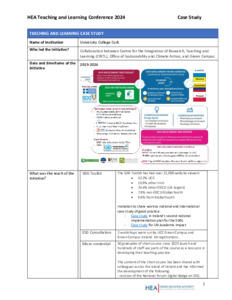 This case study from University College Cork (UCC) outlines Integrating Education for Sustainable Development in UCC: toolkits, digital badges and people (2019–2024). Led collaboratively by CIRTL, the Office of Sustainability and Climate Action, and Green Campus, the initiative comprises four interconnected strands: development of an open-source SDG Toolkit for Teaching and Learning; a national ESD consultation; a 24-hour micro-credential in Learning and Teaching with the SDGs; and the recruitment of a dedicated Education for Sustainable Development (ESD) Officer. The initiative has engaged over 21,000 SDG Toolkit users globally, delivered 17 CPD workshops to approximately 500 staff, supported whole-institution SDG programme mapping (60% of programmes mapped by February 2024), and fostered national and international collaborations. The work aligns with UCC strategic priorities, Ireland’s ESD to 2030 strategy, and UNESCO sustainability competence frameworks.