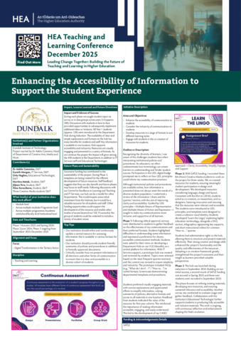 This case study from Dundalk Institute of Technology (DkIT) describes a multi-phase initiative to enhance the accessibility and inclusivity of institutional information for students through the development of a Department Hub on the VLE. Led by Dr Adèle Commins, the project applied Universal Design for Learning (UDL) principles to simplify policies, procedures, and key information using varied formats such as FAQs, infographics, videos, and screencasts. Students were engaged as co-creators in designing and refining resources, contributing to the CASES approach (Clarity, Accessibility, Simplify, Engage, Support). Surveys and student feedback informed iterative improvements, with approximately 200 staff and 3,000 students impacted to date. The project demonstrates how co-creation and UDL-informed communication can strengthen clarity, accessibility, and the overall student experience.