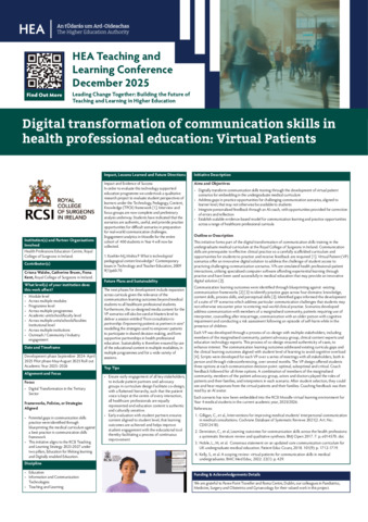 Walshe, Criona, Bruen, Catherine and Kent, Fiona (2026) Digital transformation of communication skills in health professional education: Virtual Patients. In: Higher Education Authority Teaching and Learning Conference 2025, 2025, Dublin.