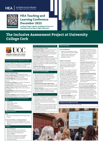 Finnegan, Nuala, McEntee, Mark, Fitzgerald, David, O’Sullivan, Catherine, Morrison, Alan, Kenna, Therese, Murphy, Linda, Power, Nollaig, O’Mahony, Conor and Escudero Fontan, Blanca (2026) The Inclusive Assessment Project at University College Cork. In: Higher Education Authority Teaching and Learning Conference 2025, 2025, Dublin.